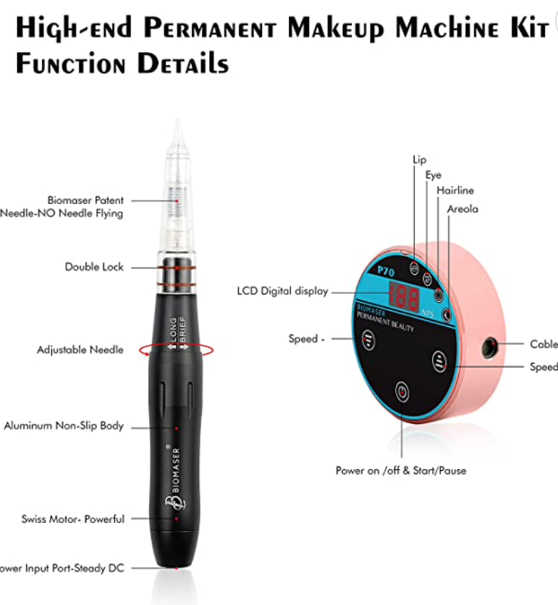 - This BIOMASER P70 Permanent Makeup Machine Kit has the mini power supply and new handpiece which use 12Vcoreless motor and give you a great experience of permanent makeup.